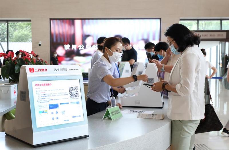 上海市浦东新区2019年率先启动“一业一证”改革。这是在浦东新区企业服务中心办事大厅,工作人员指导市民通过手机小程序办理一网通办业务(2020年8月4日摄)。