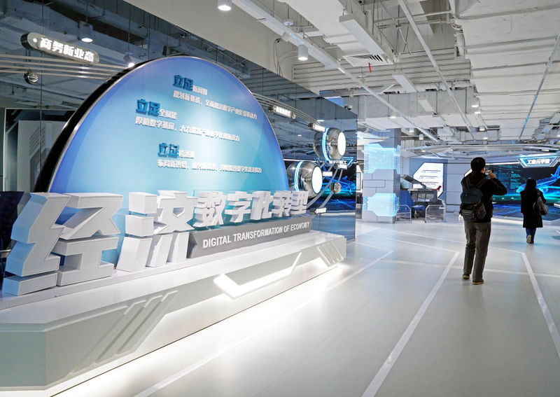 观众在位于上海市杨浦区景星路的上海城市数字化转型体验馆参观(2023年4月7日摄)。该馆展示上海各方面数字化转型的规划布局和最新实践。