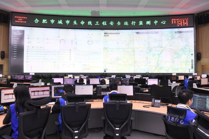 技术人员在位于清华大学合肥公共安全研究院的合肥市城市生命线工程安全运行监测中心值守(2024年4月8日摄)。合肥市2015年启动城市生命线安全工程建设,逐步构建燃气、桥梁、供水、排水、热力、综合管廊、消防、水环境八大领域立体化监测网,探索出一条以场景应用为依托、以智慧防控为导向、以创新驱动为内核、以市场运作为抓手的城市安全发展新模式。